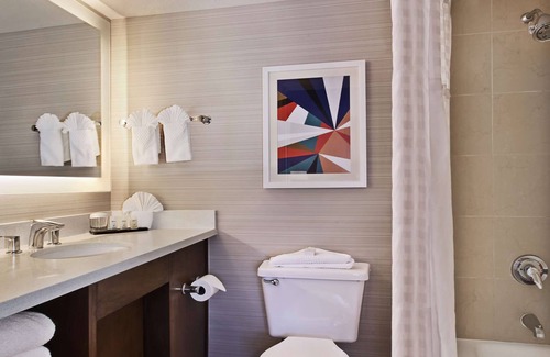 Embassy Suites by Hilton Anaheim North offers 223 air-conditioned accommodations with safes and coffee/tea makers. Accommodations have separate sitting areas and are furnished with queen sofa beds. 55-inch flat-screen televisions come with premium digital channels. Refrigerators and microwaves are provided. Bathrooms include bathtubs or showers, complimentary toiletries, and hair dryers.