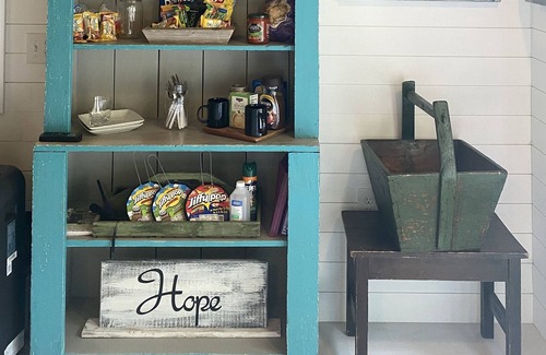 We provide some light grab-and-go snacks, quick breakfast items, and basic easy-to-prepare meal items so you don't need to rush off to the store. Things like pasta and sauce, farm fresh in-season fruit, veggies and eggs, pancake mix, oatmeal, PB&J, popcorn, granola bars, and chips. Options vary by season.