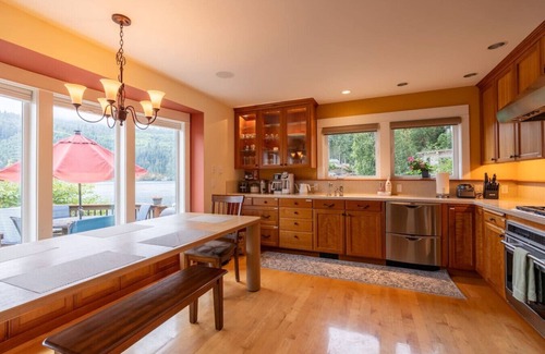 The fully equipped kitchen provides your favorite aromatic coffee drinks as well as everything you need to prepare delectable meals, ideal for gathering around the 10-person dining table next to the panoramic window that frames breathtaking lakeside vistas or enjoying al fresco on the spacious deck. Abundance storage space, well-designed lighting combined with high end appliances make delightful time in the kitchen.