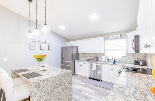 The kitchen is fully equipped for cooking delicious meals, it has a breakfast bar, dishwasher, stove/oven, microwave, coffee maker, toaster, utensils, etc. The dining area seats 6 guests with additional seating in the kitchen island and outdoor patio.
