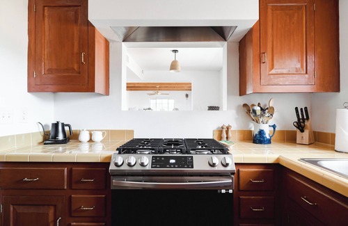 Nestled in the serene desert landscape, this chic adobe home offers a unique and memorable experience for those seeking a tranquil escape from the hustle and bustle of everyday life. The interior of the home is thoughtfully designed with a western bohemian flair that features earthy textures and antique items. With a cozy living room, fully equipped kitchen, and comfortable bedroom, this space is perfect for a romantic getaway. The real magic of this desert escape lies in the courtyard. With dining for 6, it’s the perfect place to host friends and family for dinner. When you’re ready to venture out, there are plenty of dining, shopping, and outdoor activities nearby.