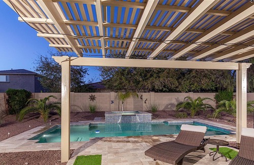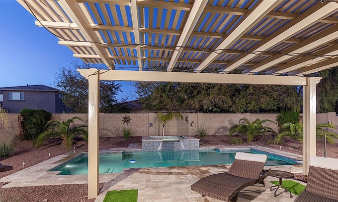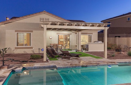 Welcome to our "Enchanted" home in Surprise. This 3 bedroom, 2 bath home is bright, cheerful, and super cozy.As you enter the home, you will go down the hall into the open floor plan. The living area is painted in a beautiful vibrant color featuring a brown leather L shaped couch ready to sink into. There is plenty of lighting from the lamps as well as the ceiling fan/light combo. There is also a flat screen TV with cable, DVD player, and a phone with a land line.The kitchen is off the main living area and flows perfectly. Beautiful wood cabinetry, granite counter tops, stainless steel appliances and even a wine mini fridge complete this open kitchen. There is a breakfast bar with 3 bar stools for excess seating.The dining area looks out to the backyard oasis and has plenty of space around the stone top table with 2 benches and 2 end chairs.The 2 guest bedrooms that are located to the left of the entrance both feature queen size beds, nightstands with lamps, and cozy bedding.The master bedroom is located in the back of the house with views of the backyard/pool area. It has a king size bed, 2 nightstands, dresser with a flat screen TV with cable.The backyard is outdoor living at its finest! There is a private heated pool, a relaxing spa with water feature, and a pergola covered patio poolside. Love to grill? There is a built in barbecue ready for your steaks. This home will definitely allow plenty of relaxtion or wow your guests for entertaining.This home is just minutes from the Surprise Spring Training Facility, The University of Phoenix Stadium, West Gate Shops, Tanger outlet mall and so much more. You will love the location of this home. Home Features:- Private heated pool/spa *Pool heat is an additional daily cost. If you would like the pool heated during your stay please inquire about a quote from your agent.*- High Speed wireless internet- Land Phone Line for local calls- Two flat screen TV's with Cable- Outdoor built in barbecue- Pergola covered patio- Attached two car garageNearby Attractions:- Spring Training- University of Phoenix Arizona Cardinals Stadium- Jobing.Com Hockey Arena- Tanger Outlet Mall- West Gate Shops and Nightlife- Fiesta Bowl