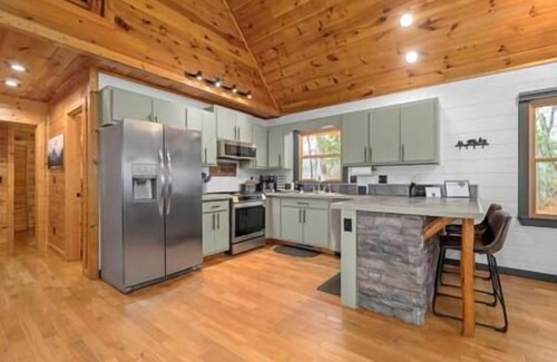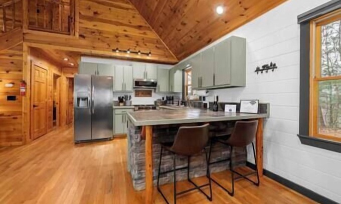 Nestled in the Aska Wilderness, this luxurious cabin is a 15-minute drive from Blue Ridge and Ellijay, Georgia. It features three decks with stunning Blue Ridge Mountain views. Inside, there’s custom furniture, a fully stocked kitchen, and comfortable beds. The terrace level has entertainment like a pool table, wet bar, and arcade games. Nearby, enjoy kayaking, tubing, and waterfall hikes. The Toccoa Riverside Restaurant offers fine dining, blending relaxation and adventure.
