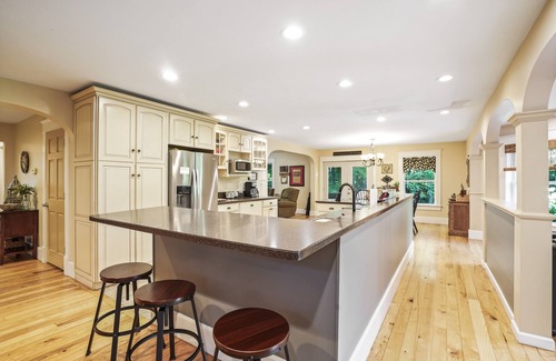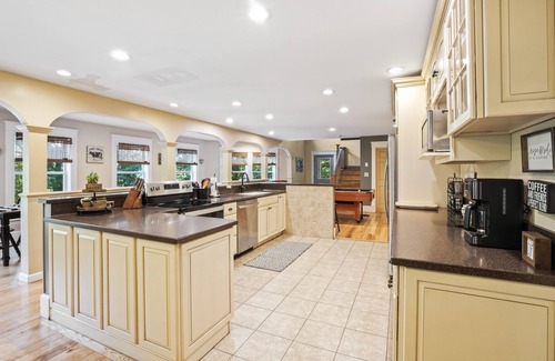 It has everything you could ask for from Wifi, hot tub, grill, fire pit and large yard on 4 acres of land. Sleeps 14