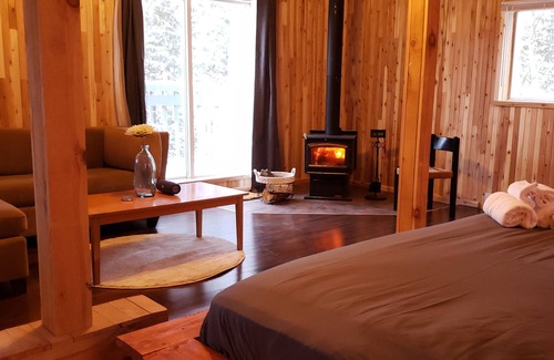 The entire Chalet is yours! The various seating areas around the property allow you to enjoy every view, of the beautiful interior. There are three bedrooms on the main floor and the Master Suite with a King size bed and wood-burning stove on the second floor. It is truly a dream to wake up to the crackling fire and beautiful view of Lac Patterson from the Bedroom.