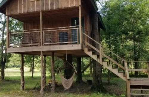 In the country and in the trees! Similar to what you'd see in Treehouse Masters, it is air conditioned and has running water. Come enjoy the peace and quiet of Central Alabama farm land with plenty of room to stretch out and explore. It has a TV with local channels, small kitchenette area, bathroom with toilet and unlimited hot water.