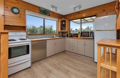 Start your mornings with a cup of coffee on the north-facing covered front porch, basking in the warmth of the morning sun. Feel the refreshing sea breeze from the inlet during the warm summer months, creating a delightful atmosphere. Ducks, quail, pheasants, tui, and fantails regularly visit the garden, adding a touch of magic to your stay. With partial fencing, children can play safely on the lawn while you enjoy peace of mind.