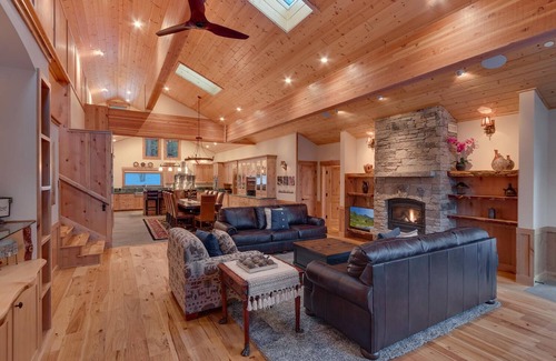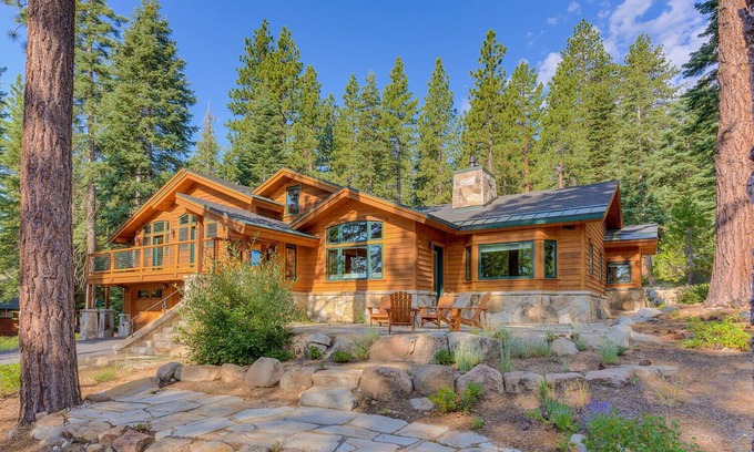 Surrounded by lovely, mature trees and perennial bushes on a half acre, Enchanted Ridge is an impressive, craftsman-style, Carnelian Bay vacation rental home. The interior finishes, including natural rock, granite, gleaming slate floors and alder wood cabinets offer both luxury and comfort. The spacious kitchen will impress the most discriminating chefs, while the great room boasts a large seating area with soaring ceilings, skylights and a stone ensconced fireplace. The downstairs family room, with a comfortable sectional sofa seating, 75" LG smart television, and access to the beautiful backyard, is the perfect retreat for the kids. Just a few stairs up, pass through the loft overlooking the great room with a foosball table and 65" smart television, to the guest bedrooms. Bedroom #2 and #3 are en suite bedrooms and include access to the large front deck, with peek views of Lake Tahoe. Both are well designed for restful nights. The spacious primary suite, with a large walk-in closet, is conveniently located on the entry level for those who do not want to ascend stairs. At day's end, an impressive oversized stone patio with a new Marquis hot tub invites you to enjoy your enchanted evening outdoors under the spectacular stars and glowing purple and orange sunsets. An Enchanted Ridge is certainly is!