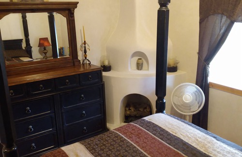 The Enchanted Suite is a beautiful pueblo style cottage that features one master bedroom with a Kiva styled fire place, and can comfortably sleep 2-4 people. The Enchanted Suite is fitted with a full kitchen, complete with cooking utensils and gas stove, as well as an in unit washer/dryer.