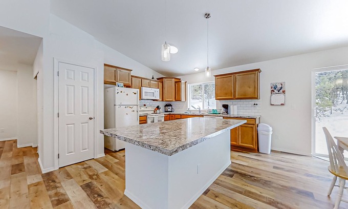 Inside, a sun-filled living area welcomes you to kick back and relax amidst the high ceilings and comfortable furnishings. The open-concept layout makes for seamless entertaining and downtime while streaming movies or playing board games at the table. When mealtime arrives, cook up tasty treats or hearty meals in the full kitchen hosting modern appliances, a sparkling center island, and lovely views out the living room windows.