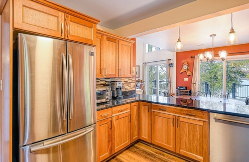 Step into your little piece of lakeside paradise and be welcomed by a sun-soaked, open-concept living area complete with high ceilings, expansive windows, and sophisticated decor. Snuggle up on the plush sofa to stream your favorite movies or break out the board games. Perhaps use the telescope for some nighttime stargazing! A well-appointed kitchen boasts stainless steel appliances and gleaming counter space for effortless meal preparation. Gather to share home-cooked meals and lots of laughter at the spacious dining table. Utilize the outdoor grill to cook up the catch of the day and unwind on the large furnished deck with great views of the lake. On the lower level, the main bedroom hosts a workspace, comfy linens, an en suite bath, and even more majestic views.