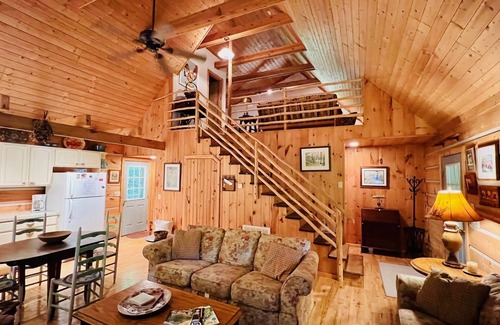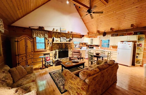 Beautiful BUDGET FRIENDLY Cozy Log cabin rental. One queen Bedroom and full bath on the entry level and a large loft upstairs with two twins, futon, cot, and a private bath. Spacious private deck off Bedroom to enjoy the sounds of the meandering creek located on the property. This log cabin offers privacy, yet you are in town in five minutes. Cozy stone fireplace in the great room and a covered front porch with comfy furniture to soak up the incredible mountain setting. Trails on the property to explore.