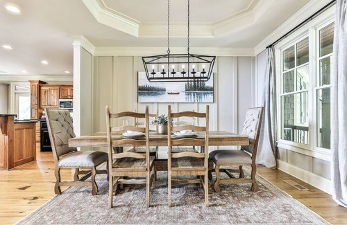 This beautiful open-plan lodge features a well-appointed kitchen, ideal for preparing meals, coffee, or snacks. The kitchen includes Keurig and drip coffee makers and opens to the living space, allowing chefs to be part of the fun while enjoying nature views. The dining room seats six, with additional seating for ten, offering stunning mealtime views. Outside, the deck provides more seating for dining or drinks.