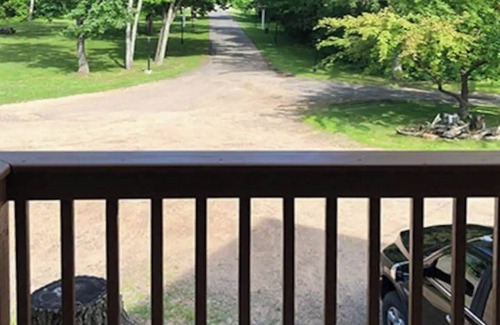Enjoy a quiet stay on your own private deck by the lake in Room 21: Ponderosa-a Western Themed Chalet | Ski Chalet in Rice Lake