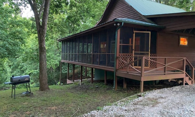 You don't have to imagine waking up to the sounds of a waterfall next to you at this cabin. You are right over it! This is the third of three cabins on this awesome property. From this cabin you can view the lake, listen to the waterfall, and see the white river. Beautifully crafted wood on the inside invites you to a more relaxing way of life. The house opens to the living room, with a corner section of space that holds a queen and a twin bed for extra friends or family. Comfy furniture and a perfect kitchenette give you the ability to prepare your own meals while on your retreat. There is a private bedroom with a king bed in this cabin that overlooks the waterfall, and it is sure to please. Enjoy exploring the property, go fishing in the lake. There are complimentary kayaks and a Jon boat to use. Common spaces on the property also includes a huge rock outdoor fireplace, pavilion with outdoor kitchen space, a gazebo, an outdoor pool, lake access and river access and the newest addition-The Outhouse Lounge. There you can play a game of pool, pinball, or Galaga and listen to music or watch a football game on the large smart tv. This cabin does not have a bathtub but does have the only shower. The front and side of this cabin has a large screened in area to listen to all the sounds of nature, relax, and enjoy the serenity of the Ozarks. The screened in porch has a dining table to have your meals outside and its own grill and fire pit right outside the cabin. This place has so much to offer for the same price as some that just have a cabin on the river.