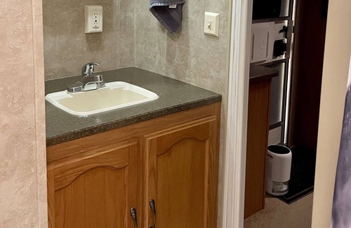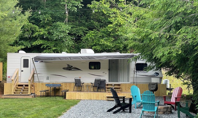 Located in the beautiful Appalachian Mountains with private access to the Linville River. Spend you day enjoying nature, visiting Wineries, shopping, or floating in the river. Wind down beside our firepit while your dinner is cooking on the charcoal grill! Large, grassy lot with plenty of room for kids and dogs to play. Park Model camper has 2 slide outs, super slide in living/kitchen area and a slide in master bedroom. Shower with tub in bathroom. Microwave, residential refrigerator, and 3 burner gas stove with oven in kitchen. Laminate & carpet floors. Both bedrooms feature a full-size bed and ample storage. Front bedroom has a solid door, master bedroom has an accordion door to bathroom and a solid door between bathroom and kitchen. The living room offers a sliding glass door. Coffee pot, mugs, plates, silverware, pots, pans, dish towels, and basic utensils provided. Firewood is available for purchase from host, $25 a bundle. Bed and Bath Linens can be provided for an additional fee of $50.00.
