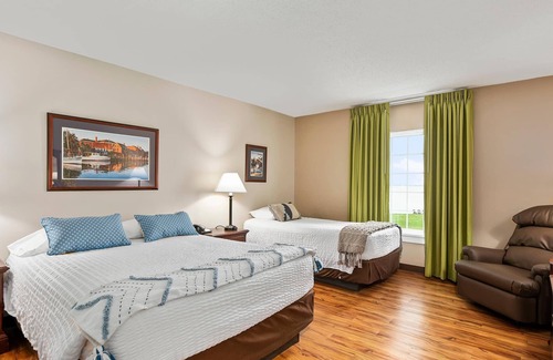 The handicap accessible rooms have been newly updated and renovated to meet ADA standards, which includes a wider bathroom doorway, a higher toilet, a large walk in/roll in shower with chair, and support rails throughout the bathroom. This 300 sq. ft. room has one queen bed and one extra-long twin bed with comfortable 3-inch memory foam toppers for a great night sleep. It also includes a lounge chair recliner and non carpeted floors. This room can comfortably sleep two or three guests, with a maximum occupancy of four. Each handicap accessible room connects to an adjoining Standard Deluxe room in order to accommodate a caregiver.