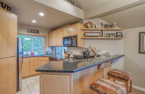 Step into this spacious Mt. Bachelor Village condo and prepare to be wowed. Huge floor-to-ceiling windows bring you sweeping views of the Deschutes River below, the wooded hillside beyond, and the steep, boulder-strewn, sagebrush cliff. You can sip your morning coffee listening to the river roar, the birds sing, and the wind sift through the treetops, whether the landscape is graced with muted desert hues or frosted with new snow. You and your guests will happily gather in the large living room space, with plush sofa and chairs, high ceiling, gas fireplace, wall-mounted flat screen TV/DVD, a dining table, and breakfast bar. The fully equipped kitchen has all you’ll need for informal dining, and you’ll love the large windows over the sink that bring nature in. The spacious bedrooms are made even more open with a mirror wall and floor-to-ceiling windows. The large shared bath has a separate bedroom entrance. A third bedroom suite has a private entrance, making this a great space to share with family or friends. This spacious room has its own TV, coffee-making space, mini-fridge, desk, sitting area, and full bathroom. Walk out your door and gaze down the canyon as the wind sifts through the trees, or join the 2-mile Deschutes River Trail from the resort. Hop in the car for a five- or ten-minute drive to dozens of terrific Bend restaurants and extensive shopping at the Old Mill District or Downtown Bend. Skiing at Mt. Bachelor is 20 minutes away, and Deschutes River watersports and golf are even closer. Of course, all the Mt. Bachelor Village Resort perks listed below are available to you, making this home away from home both economical and incredibly rich in amenities.