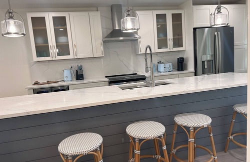 Kitchen space is defined by amazing styling and phenomenal usability. From the three door over-size fridge with ice maker, to the in-drawer microwave, to the dedicated wine and beverage fridge, you'll enjoy entertaining at the kitchen bar while the days fresh catch is prepared. No expense spared on the layout or kitchen amenities, including coffee maker with pot or pod option, Ninja air fryer, electric kettle, griddle, small deep fryer, blender, a complete knife block and full set of cooking utensil, pots and pans.