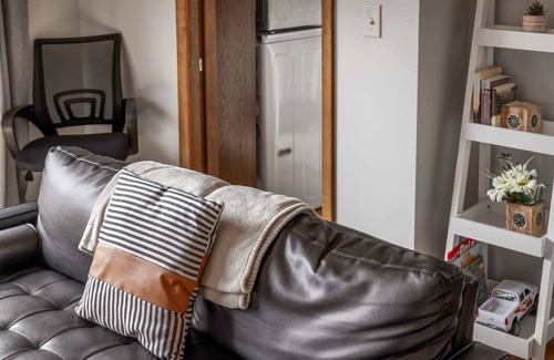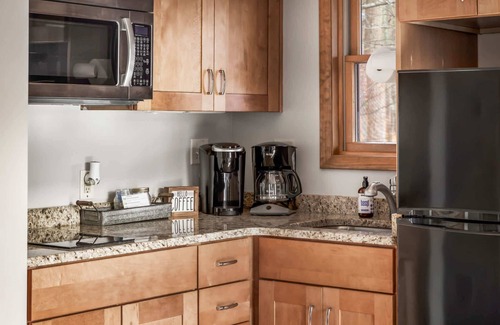 - Efficiency Style kitchen with Microwave, Keurig, Sink, Fridge, Freezer, 2 burner stovetop