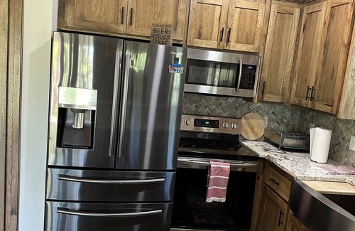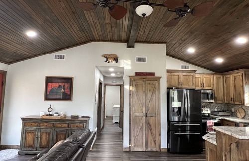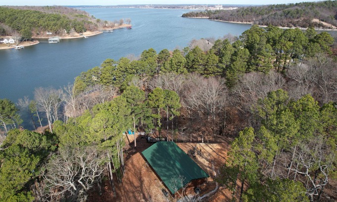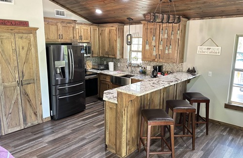 Our 2 bedroom cabin was fully remodeled a few years ago-complete with new appliances, granite countertops and many other upgrades. Still, our cabin remains a cozy & relaxing place to enjoy the wildlife & gorgeous lake view! You’ll feel like you are in the mountains amongst the pines! The towns of Grove & Jay are each just 15 minutes away. Crappie and catfish are plentiful in our cove. It is centrally located just around the corner of the popular Woodard Cove and a quick 5 minute boat ride to Shangri La Resort. (The boat dock on property is not available for guests use.) Mid America Outdoors is just 9 miles away. As a courtesy we’d like to mention that there is a home a few hundred feet away that is in the final stages of construction. This home shares the long driveway with this cabin property. There may be occasional noise, vehicle traffic and other construction related inconveniences depending on the day. Most days it’s minimal to not noticeable at all.