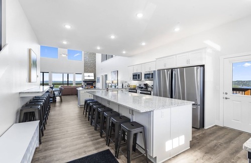 As you step inside the main level, an expansive state-of-the-art kitchen awaits all your family's favorite recipes. Equipped with dual appliances and two spacious islands, it's the perfect spot for culinary creations. Whip up your signature dishes with ease or host a cookie decorating contest on the island counters. Off the kitchen is a screened-in deck with two gas grills for your family's grill masters. Leading the way into the living area are two dining tables that seat 14 each where you can enjoy your delicious creations together. Discover a spacious living area with a floor-to-ceiling stone fireplace as its centerpiece. While adults relish the lake views through a wall of windows, children can dive into fun of their own in their designated play zone. Looking for a cinematic experience? The private theatre room, with its plush recliners and bar top table, guarantees a movie night like no other. Head onto the main level deck where you will enjoy fresh Ozarks air and breathtaking views of Table Rock Lake. You can enjoy meals at the patio tables or relax in the hammocks or Adirondack chairs. On this level, you will have four king ensuites ensuring a great night's sleep with ease.