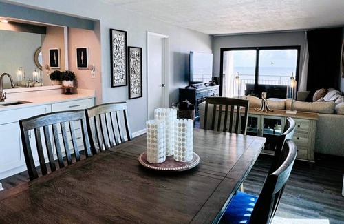 An open dining room holds a large table that allows seating for 6 with beautiful views of the ocean and a wet bar/buffet area for easy entertaining.