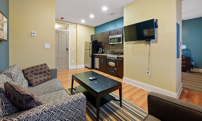 The unit features a cozy living room with a comfortable sofa, a flat-screen TV, and plenty of natural light. The bedroom boasts a plush full-size bed, a dresser, and a closet for ample storage. The bathroom is clean and modern with a shower/tub combo. The fully-equipped kitchen includes a refrigerator, stove, microwave, marble countertops, and coffee maker, along with all necessary cookware and utensils. Not to mention in-unit laundry!