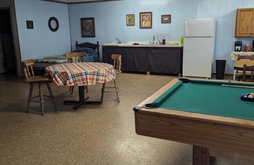 Lupton awaits you with a comfortable yet roomy 2-bedroom haven, featuring 3 queen beds and 4 twin beds to accommodate up to 10 guests. The kitchen is equipped with a full-size refrigerator, coffee maker, microwave, and a two-burner stove, complete with pots, pans, and dual sinks. For your entertainment, a generous living room offers WiFi, television, and a pool table.