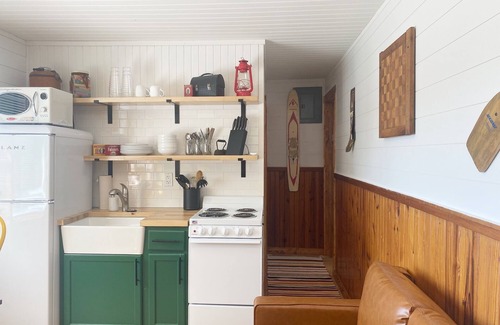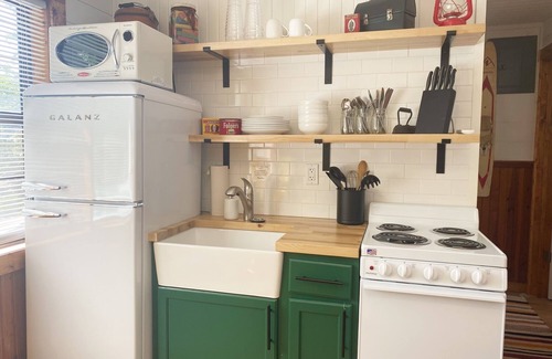 Gladstone Cabin #10 is named in honor of one of the towns that now lie at the bottom of the lake, the town of Gladstone. Years ago, this cabin was located at another resort down the water's edge from Niangua Hills Resort. The cabin was torn down and rebuilt on the new resort grounds and still features the original pine walls, which dates this structure to the area of it's time. This incredibly cozy cabin offers one of the best views of the lake from the resort. Enjoy having your coffee on the private deck each morning! Cabin #10 has been newly renovated and now features a new kitchenette with new appliances, a new bathroom with a beautiful tile shower, new floors, fresh paint, new bedding, new furniture throughout the cabin and the installation of an efficient mini-split air unit.