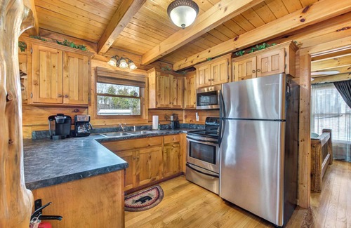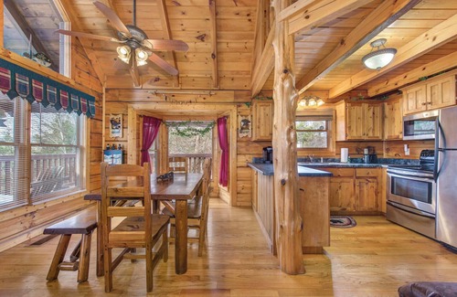 The cabin's interior is a blend of mountain charm and modern sophistication, with large windows on both ends bringing in plenty of natural light. The living room features a stacked stone fireplace, comfortable chairs, and a wide screen TV mounted above the mantel with internet. The well equipped kitchen takes the stress out of driving to dinner, while the dining room has the beautiful log wood table by a bay window. The wrap-around porch provides many opportunities for relaxation, whether you bring your coffee out to the porch swing or soak in the private hot tub as the starts come out each night. In the evenings, head upstairs to find a pool table and a multiple arcade game table in the sleeping loft with built-in-bunk beds. The main bedroom has a king size bed with a Roku TV mounted on the wall. In the living room you have a queen sleeper sofa.