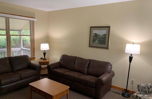 Two Bedroom King – Depuy: King in master, two double beds in second bedroom, queen sleeper sofa in living area. Jetted Bath Tub. Maximum occupancy 8. 2-Story condo.