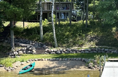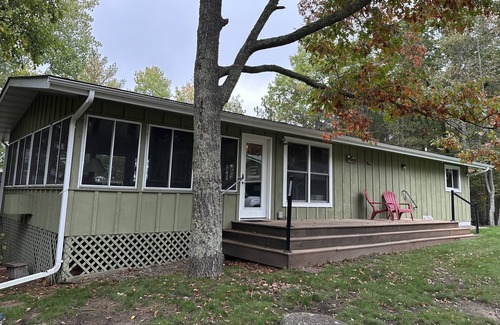 Wooded family retreat overlooking this clean, quiet lake offering spectacular sunsets, privacy, and comfortable accommodations. Perfect for entertaining family or small groups with 4 bedrooms and 2 1/2 baths, the main level has a bedroom with queen bed, another bedroom with a trundle bed and a full bathroom. The lower level has a bedroom with queen bed, a bedroom with two twin beds, one full bathroom, and a half bath. There is a bunkhouse with additional sleeping for 6 and a full bathroom. The kitchen and great room are open with views of the lake, there is a lower level family room with a wood burning stove, large 3 season porch, and deck with grill. The kitchen is fully equipped with refrigerator with ice maker, electric stove/oven, microwave, dishwasher, coffee pot, and toaster. Separate laundry room is connected to the double garage with additional bathroom and refrigerator. Cabin has electric heat and two window air conditioners on the main level. The cabin sits on a hill with approximately 15 steps down to the beach.