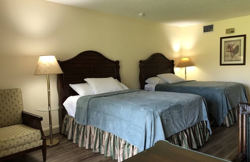 Enjoying the Saddlebrook Golf Course View since the guest Room with two double beds, bathroom with tub and shower, work desk, lamp and chair, internet access, TV, and private patio.