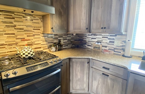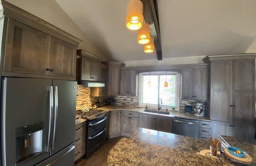The well-equipped kitchen is a great entertaining area! There is a grill on the patio to compliment what is being cooked in the kitchen. Also on the patio is relaxing outdoor living, complete with hot tub, gas fire pit and outdoor 42" TV.