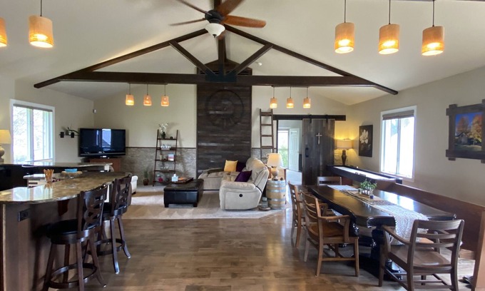 Welcome to our Chome! This former church has been converted to a beautiful, spacious 4-bedroom, 3 bath, 2 story home with 14' vaulted ceilings, massive beams, barnwood feature walls and barnwood door. Main floor has open kitchen with island and seating for 4, dining table with seating for 8, wet bar, and great room. Enjoy the 86" TV and 58" TV from anywhere in the main living area, even while playing shuffleboard.