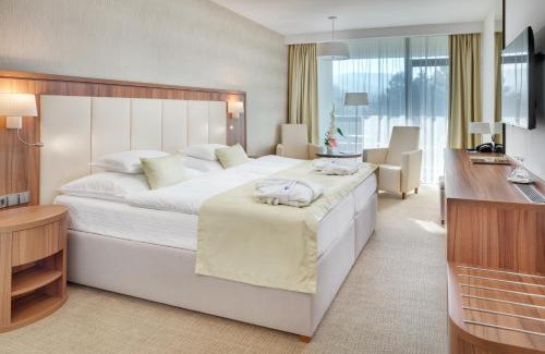Ensana Esplanade is located in the pleasant green and tranquil environment of the park, in the central part of Piestany's spa island. Free WiFi is available. Within the hotel you can find the new water and sauna world, indoor and outdoor pools with various water attractions including massage jets, hot tubs, and deckchairs. Guests can take relaxing strolls through the on-site shopping passages, sit back in the cozy coffee bar or enjoy musical entertainment in the night bar. A wide range of local and international cuisine including dietary meals is offered in the hotel restaurants and on the inviting terrace. Ensana Esplanade is directly connected to the Balneo Rehabilitation Center where a large number of curative treatments is offered.