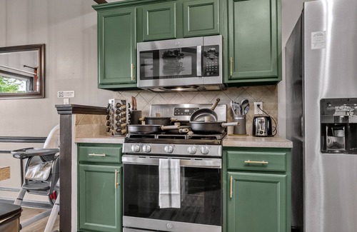 The kitchen is well-appointed featuring brand new pots, pans, and cooking utensils. Find everything you need to cook a delicious meal and take advantage of small appliances like a Keurig coffee maker, provided coffee pods, toaster, blender, and more.