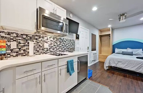 The space has a comfy queen size bed, a loveseat sofa, built in storage for clothes, and a brand new kitchen with a stove top, refrigerator, microwave, Kruerig (with complimentary k-cups), and a 32-inch tv. The bathroom also have a separate shower and toilet space to accommodate multiple guests.