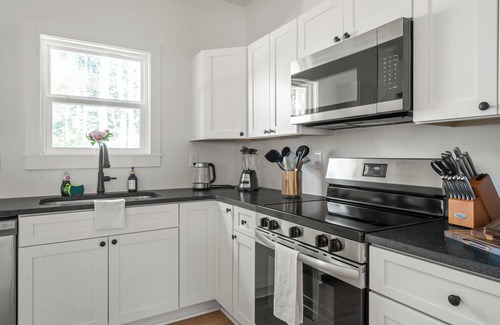 Fully equipped kitchen with stainless appliances & cookware