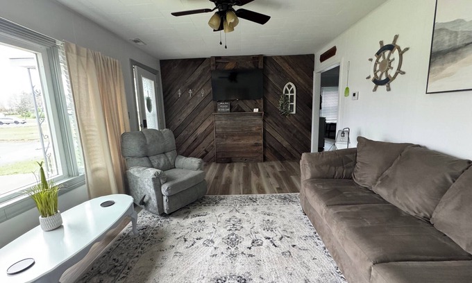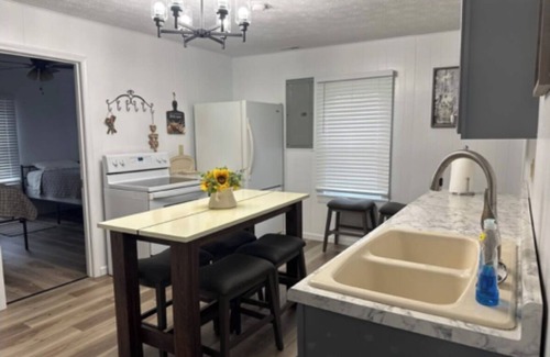The house has a cozy layout which we love and has the perfect space for cooking, entertaining, playing games, relaxing, etc.. The home comfortably sleeps 6. The home includes one large bedroom (Queen Bed). The second bedroom includes 2 twin beds. There are ceiling fans in both bedrooms and the main living room area. All Bedrooms are equipped with Smart TVs for your entertaining needs.
