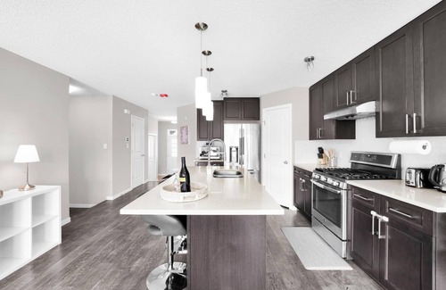 This extremely clean, bright & welcoming 3 bedroom duplex home boasts over 1750 sqft includes a well furnished living room & a full size stocked kitchen. Enjoy 3 bedrooms with 1 king size bed, 2 new queen size beds and a twin sofa bed with hotel quality bedding, new linen and towels, closets and a dresser is provided. This home is situated in the safe neighborhood of Summerside and is convenient to Airport, Downtown, Malls and other major attractions. 15 min to Edmonton Airport, 10 mins to South common mall, 20 mins to downtown and 25 mins to West Edmonton mall.