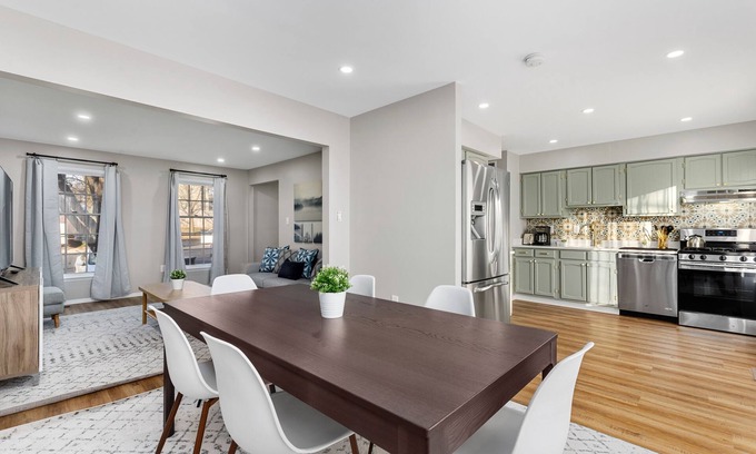 Upon entering through the front door, you will see the living room to your right, the stairs directly in front of you and a hallway that leads to the Kitchen. The Kitchen, Dining Room and Living Room are connected with a wrap around, open concept layout. The Dining Room features a large table that seats 8 guests. The living room has a 65” in. ROKU TV set up in guest mode for you to enjoy you’re personal streaming services.