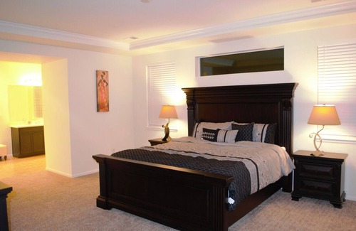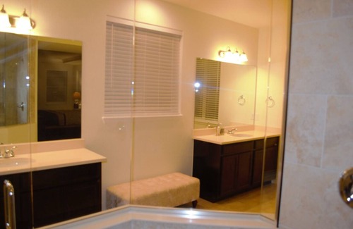 The house is spacious with vaulted ceilings. It has 5 bedrooms with 1 bedroom on the main floor. The main floor also offers a large dining area, an office and a large living room. The kitchen includes double oven , gas stove and utensils if the guests choose to cook. The master bedroom is large with an awesome luxury bath. The second floor has 4 bedrooms and laundry room.