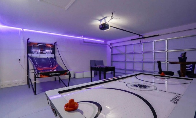 Entertainment: Game room with air hockey, ping pong, foosball & basketball arcade.