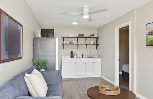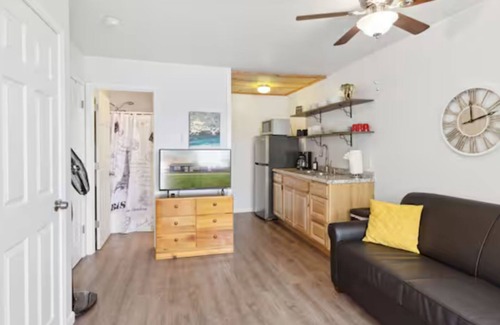 1-bedroom units, and a central unit with full kitchen and meeting space. Each unit has a kitchenette, living room, and private bathroom. Sleeps up to 28 with 10 full sized beds and 6 pull-out couch’s.