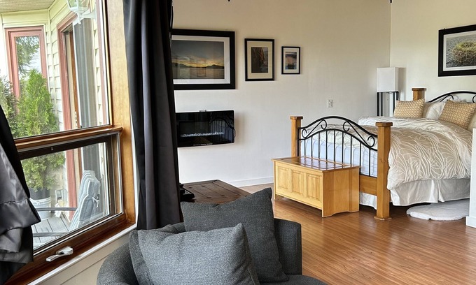 Spacious over 800sf Suite with to queen size beds and sofa bed. Good for family. Wall electric fireplace, fridge, microwave, Smart TV, WI-FI. Private entrance, balcony, bathroom. Peaceful, relaxing. Luxury share hot tub with foot massage. Sunset, sunrise and stars you can see from your own balcony. Close to town, restaurants and lakes. Hiking to Mt.Maxwell start from the gate.
