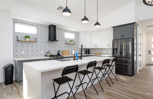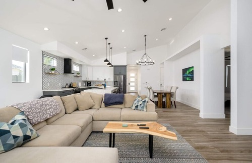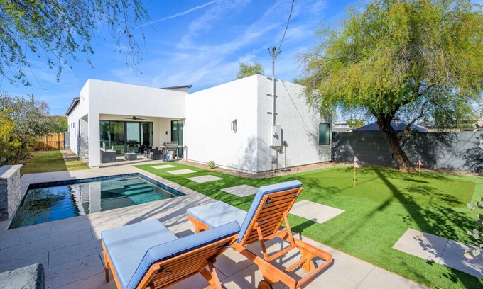 Stay cool in central Phoenix at this 4-bedroom modern home with its own private pool and backyard mini-golf course. Just 10 minutes from downtown and close to Biltmore, the location makes it easy to explore. Inside: a sleek open kitchen, electric fireplace, and smart TVs. Outside: BBQ grill, lounge seating, and space to spread out. Great for groups or families looking for a fun and comfortable Phoenix getaway.