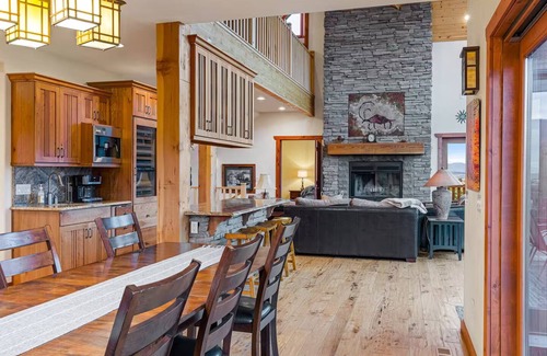 The modern, open-concept kitchen is fully equipped with Wolf appliances, utensils, cookware, and everything else you need to feel at home. This thoughtfully designed home provides ample counter space, a large island, and multiple dining options for group meals. The dining area seats 16 guests at the custom-built dining table.