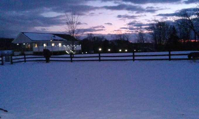 Come and enjoy the peace and serenity offered at this mountaintop chateau, hosting a retired racehorse named Gleason for your viewing pleasure. Experience the hoofbeats on the grass in the morning as he charges to the barn for his morning feed, while the sunrise is viewed from the living room. Gleason still actively shows in the summer as he is 8 years old, and you may catch one of his daily training sessions, which consists of flatwork and jumping. There are panoramic views of the farm in all rooms of the house. Enjoy tranquil dinners on the 24x36 wrap around deck.